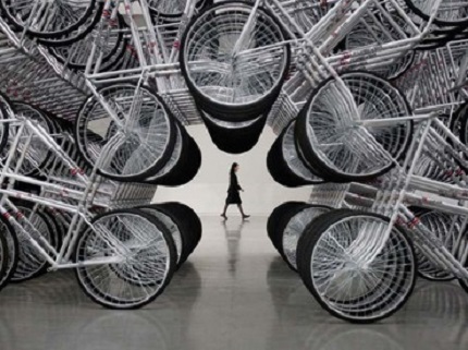 A museum employee passes an instillation entitled «Forever Bicycles» of the “Ai Weiwei is Absent” exhibition by the Chinese artist and activist Ai Weiwei at the Taipei Fine Arts Museum in Taipei, Taiwan, Friday, Nov. 25, 2011. Taiwan’s President Ma Ying-jeou visited the exhibition shortly after and in comments to the media, called on Beijing to respect artist Ai and protect his freedom of artistic expression. (AP Photo/Wally Santana)