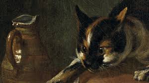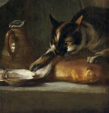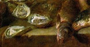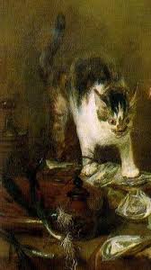 Incorpora otro elemento dramatizador en la figura de un gato que se pasea por encima del pescado y ostras, un truco tradicional de animación intrigante, que mas tarde el artista reitera en sus naturalezas muertas, para no distraerse con lo anecdótico.