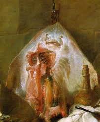 Se articula el eje central sobre la armazón clásica de un eje clásico piramidal, cuyo eje central es la raya despanzurrada que cuelga de un gancho, como el buey de Rembrand.