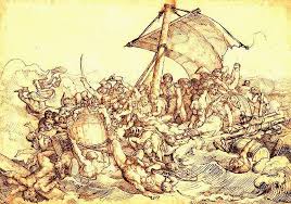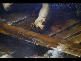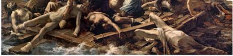 Organiza un esquema compositivo y represento la barca bamboleante con el oleaje, formando una diagonal en cuyo lugar mas elevado se suben los náufragos, da la sensación de que los náufragos puedan volcarse sobre el espectador que los observa.