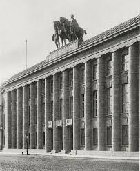 El monumentalismo se sirve de unos cuerpos de edificio cúbicos como de un lenguaje formal clasicista en el que se sirve de un orden dórico.