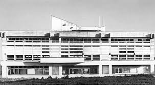 Los pilotes cónicos del edificio administrativo recuerdan a Le Courbusier