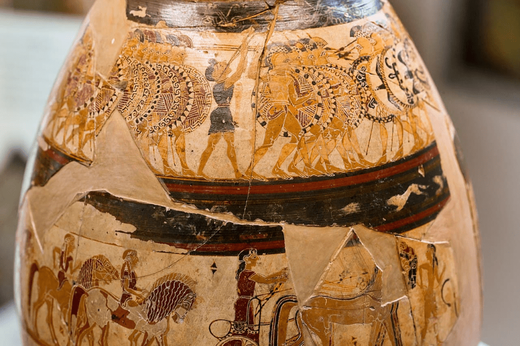 El friso superior nos transporta a un campo de batalla donde un grupo de hoplitas avanza en formación de falange, una innovación militar que pronto definiría el poderío de las polis griegas. Un músico con un aulós (flauta doble) marca el ritmo de la marcha, aportando dinamismo a la escena. Se trata de la más antigua representación conocida de la formación de falanges hoplitas.