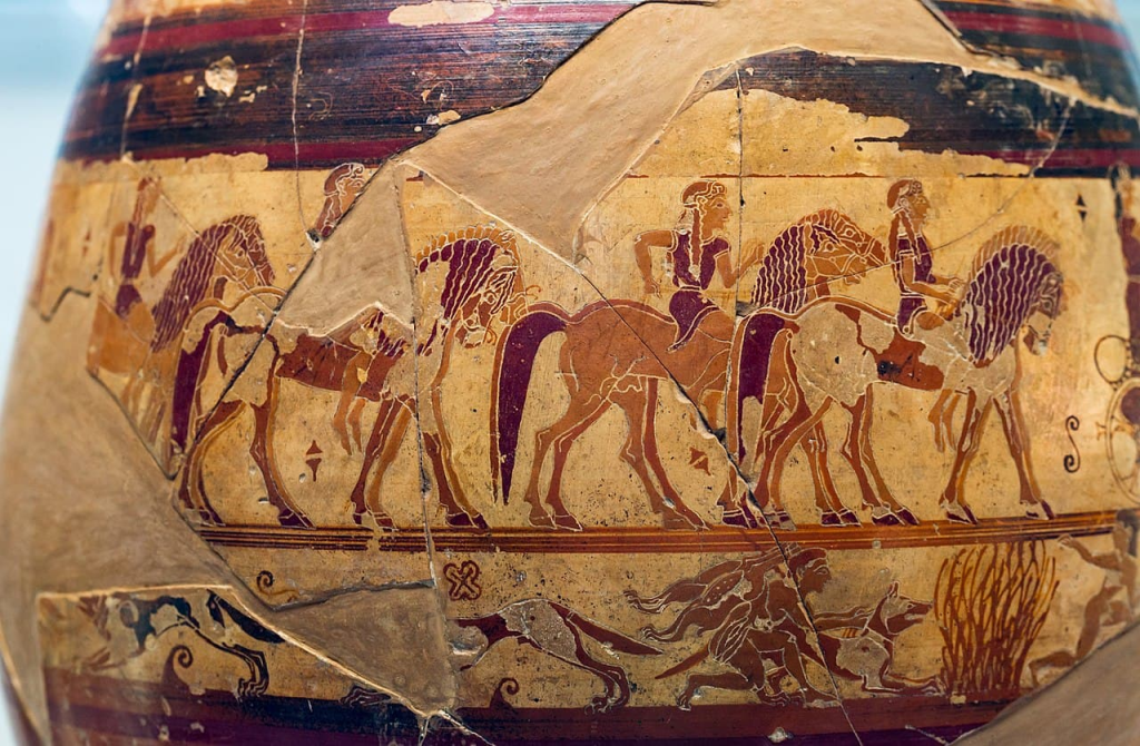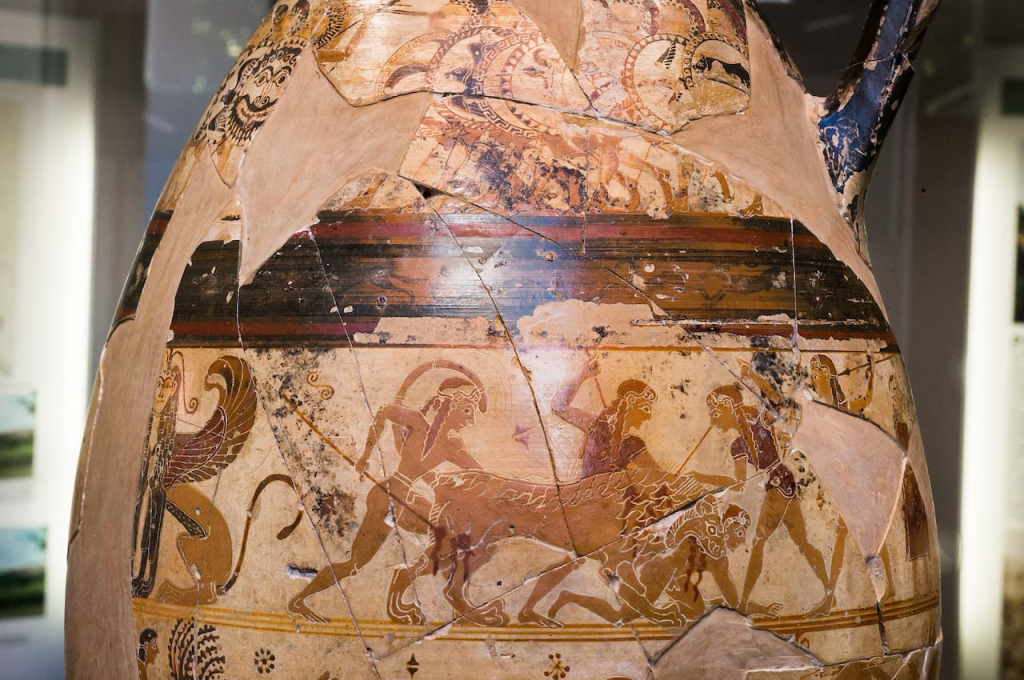 Conocido como Olpe de Chigi, por haber sido descubierto en terrenos que pertenecían a la familia principesca romana de ese nombre, no es solo una obra maestra de la cerámica protocorintia del siglo VII a.C., sino también la primera representación visual conocida del mito del Juicio de Paris, y de la formación de falanges hoplitas.