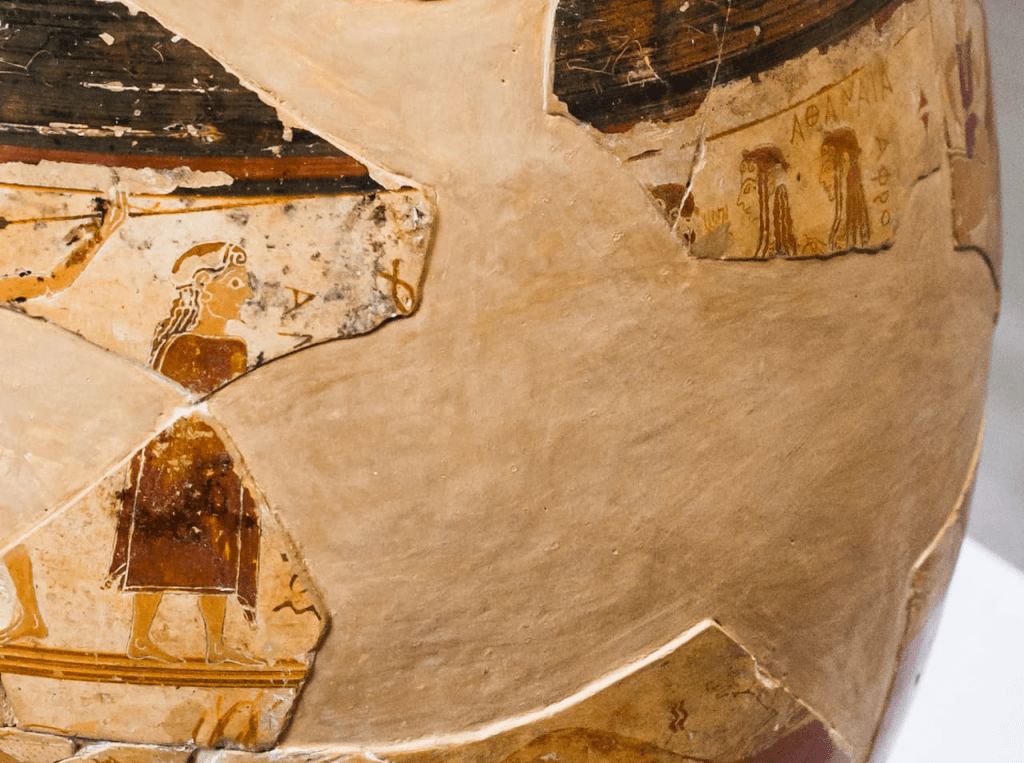 La escena del Juicio de Paris está muy deteriorada, pero el artista incluyó los nombres de los personajes representados, algo novedoso en la época. Crédito: ArchaiOptix / Wikimedia Commons