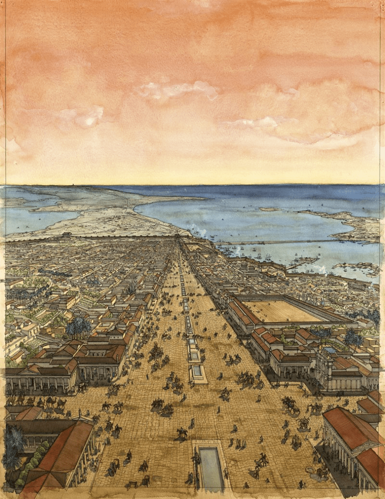La descripcion detalla y alaba con emocion los proyectos de infraestructura e ingenieria de la ciudad, que fascina a un griego culto que trbaja para Roma.