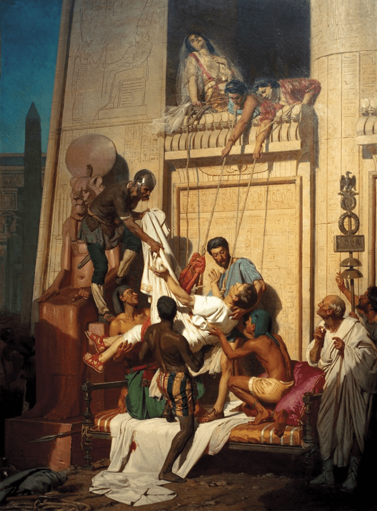 Cleopatra VII, la última reina de Egipto, murió en el año 30 a.C. tras la derrota de las fuerzas egipcias y las de su amante romano Marco Antonio frente al ejército de Octavio, heredero de Julio César y futuro emperador Augusto. Según las fuentes clásicas, Cleopatra se quitó la vida poco después de la caída de Alejandría para evitar la humillación de desfilar derrotada en el triunfo que Octavio seguramente habría organizado para celebrar su victoria.