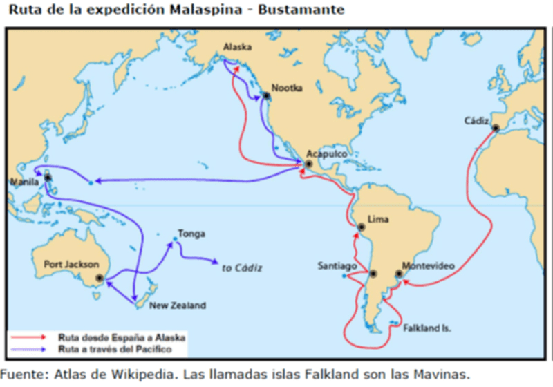 La expedición marítima alrededor del mundo de Alejandro Malaspina que parte en 1789, el año de la Revolución Francesa, también recorre parte de América, pero tiene objetivos tanto científicos como políticos.