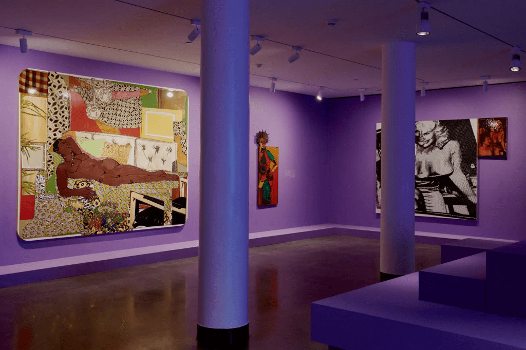 The exhibition also features works by women artists drawn from the Brooklyn Museum collection. From left, “Marie: Nude Black woman lying on a couch (Marie: Femme noire nue couchée)” by Mickalene Thomas; “Revolutionary Sister” by Dindga McCannon; and “Big Girls” by Marilyn Minter.Credit…Vincent Tullo for The New York Times