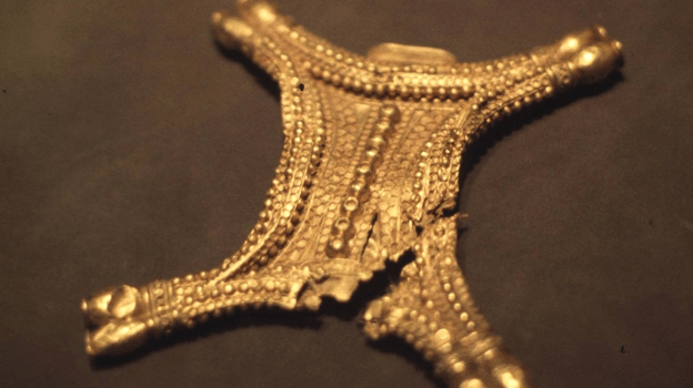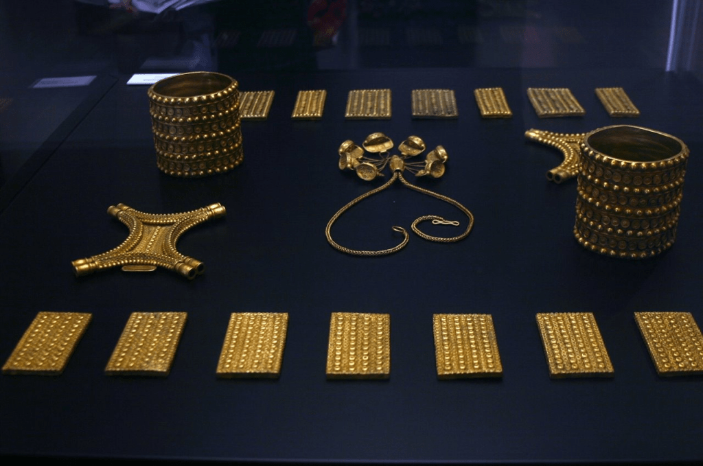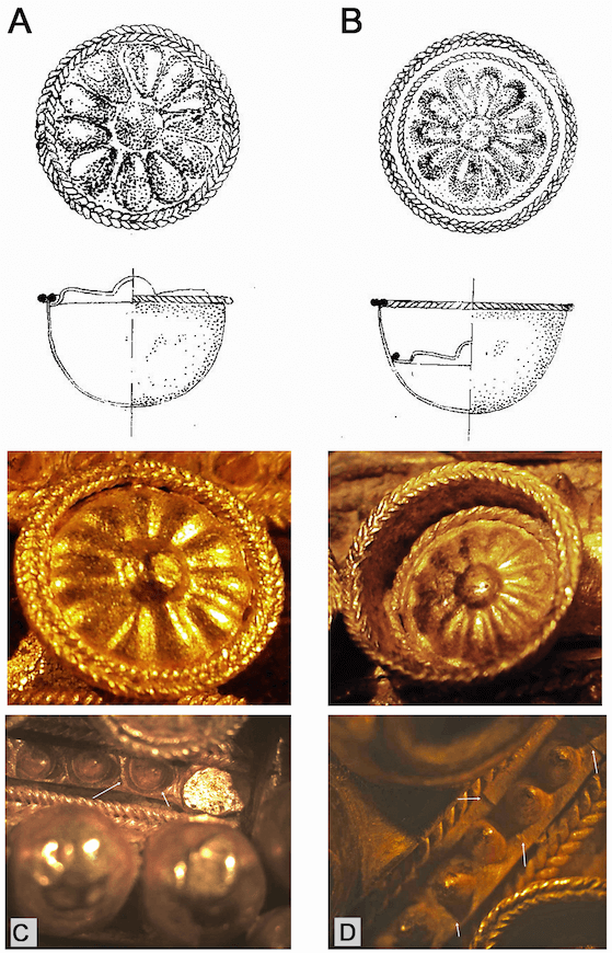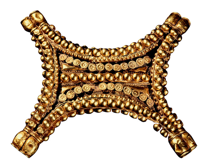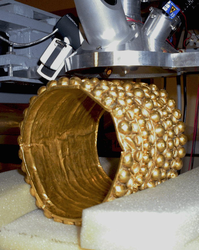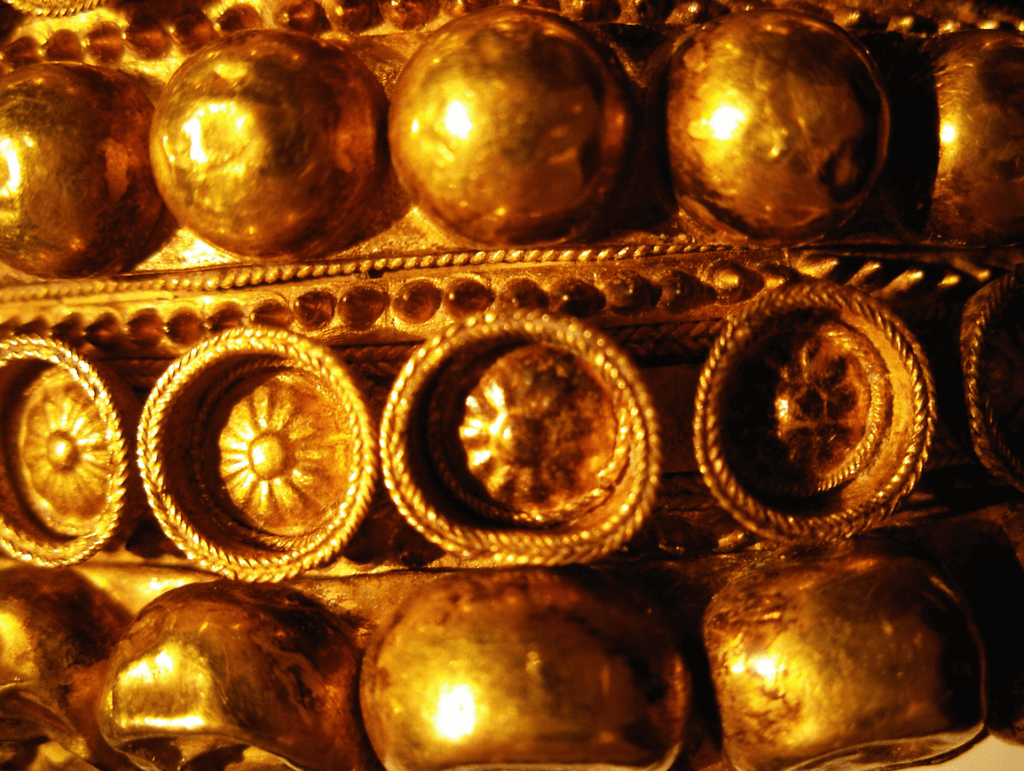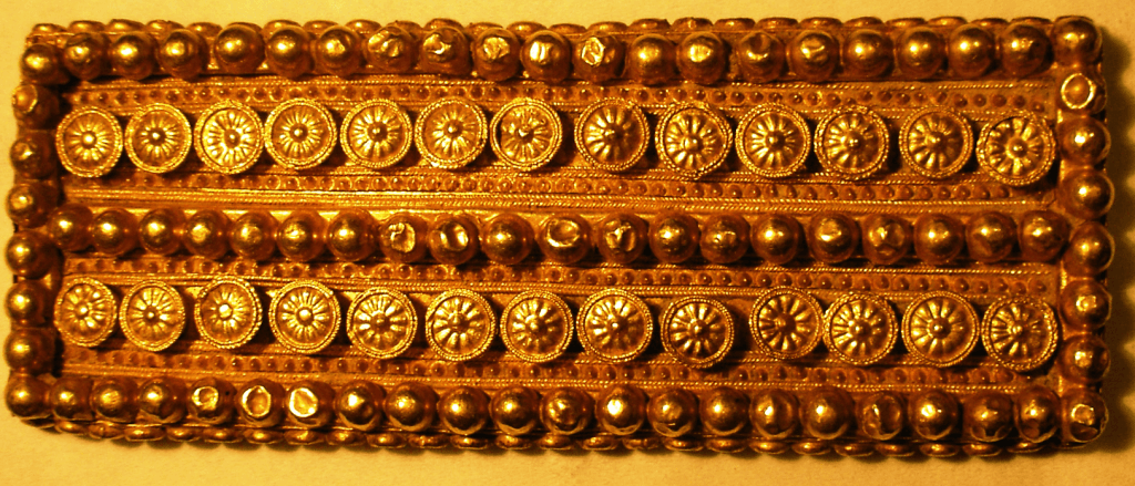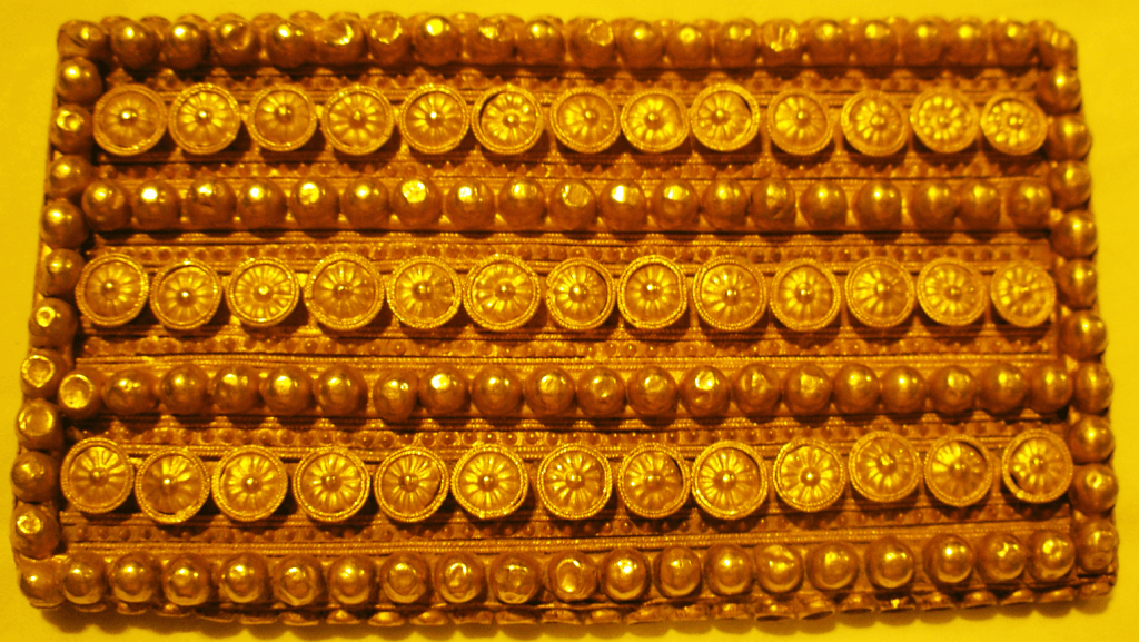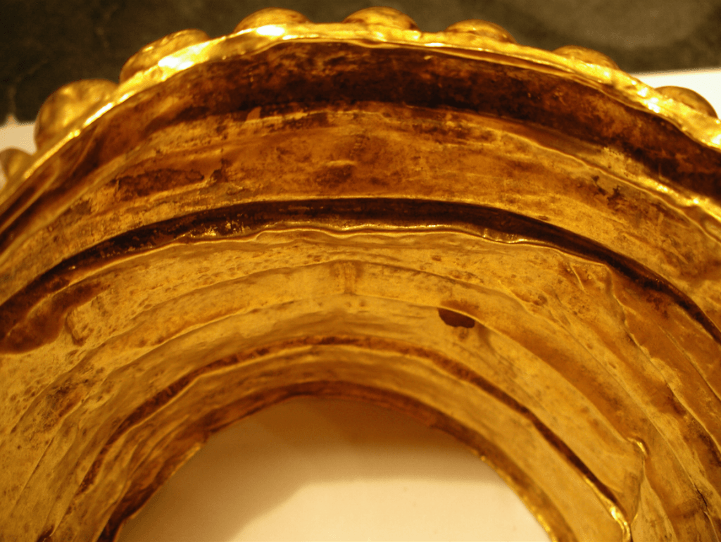 Detalles del interior de uno de los Brazaletes del tesoro de El Carambolo. Del ámbito oriental proviene el modelado de láminas por batido para formar las estructuras, las láminas peraltadas sobre las que se sueldan diversos elementos y el modelado con diferentes punzones y troqueles para dar forma a distintos elementos decorativos, las filigranas y el granulado del collar.