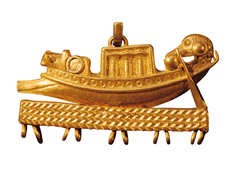 Pendiente de oro que representa un barco fenicio de guerra, dotado de un espolón para embestir las naves enemigas. Foto: Dagli Orti / Corbis