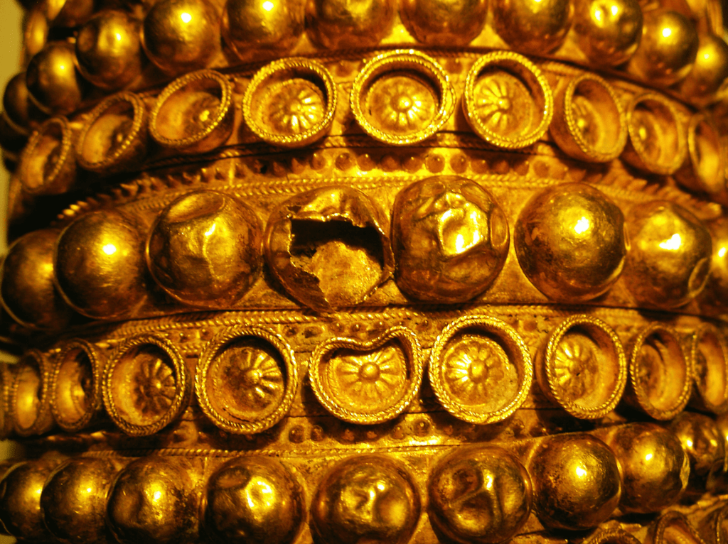 Detalles de la decoración de los Brazaletes del tesoro de El Carambolo. El tesoro se define como un conjunto de piezas que no pertenecen a un ámbito tecnológico concreto sino que en él conviven formas y técnicas propias de dos ámbitos. Al ámbito atlántico pertenece la técnica de fundido con cera perdida utilizada para la elaboración de las tiras de púas, tanto del pectoral como de las placas con rosetas, además de la forma cilíndrica de los brazales, su gran tamaño y la decoración en bandas paralelas.